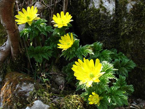 緩やかな道を行くと、やがて石灰岩の岩がごろごろと現われてくる。よ〜く見ると、小さな黄色い花がポツポツと?「おぉぉー!福寿草やん♪やっと君に会えた!(本当はイワザクラを見に行くつもりだったはずのに、平気で適当な事を言うこの神経(--;))」 さらに少し行けば、辺りは一面福寿草だらけ。もう終わりに近いかと思ったがまだまだ十分に見れる。お互い写真をせっせと撮り出す。「あっちがええでー!いや、こっちがええでー!・・・・・・もう、どうでもええでー!」 花数が多いとほとんどこういうパターンになる。(^^ゞ みれさんが花の写真を真剣に撮るなんてあまり見た記憶がない。昨日の焼岳の雪の中とは180度違うし・・人間てそんなに変われるもんなんだ(笑)