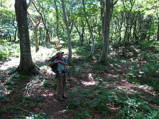 ようやく夕暮山との分岐に着く。ここは木陰で涼しい微風が吹き、快適で生き返った気分になる。たっぷりと休憩。 左折して岩籠山に向う。アップダウンが鬱陶しいが、この付近はブナが綺麗。 |