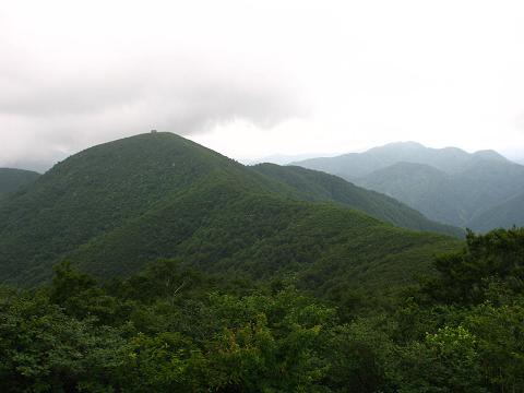 浄法寺山へ登り返す途中、上の方からだんだんと人の声が大きく聞こえてくる。山頂には多くの人がいるようだ。山頂に着いた瞬間、福井のヨシさんと目が合った。「SIVAちゃん、久しぶり〜!」「わぁー!ヨシさんやん!」 駆け寄り・・握手を交し、熱い抱擁・・ はなかった。(^^ゞ 久しぶりといっても約半年ぶりである。赤兔山が通行止で登れず、変更してこの山に来たそうである。こういう方が他にも何人かいた。さすが?ヨシさんである。大きな八木アンテナを持って上がり無線を楽しんでいた。展望台からは、朝とはウソのように周囲の風景が見える。ヨシさんとまたの再会を約束し、私は先に下山をする。冠岳へ向う途中もどんどんと人が登ってくる。冠岳の分枝から関谷コースへと入る。なだらかな道が暫く続く。