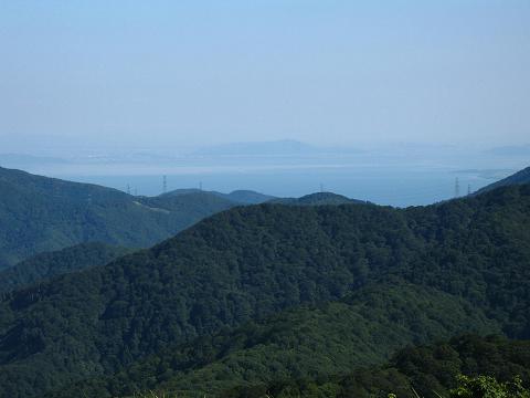 | 誰もいない静かな山頂に着く。水平線には薄い雲がかかっているが、湿度が低いせいかなかなかの展望である。東には越美の山々、西は野坂山地や若丹山地、若狭湾に突き出した小さな半島の数々、遠く奥には丹後半島が墨絵のように見える。南はしっかりと琵琶湖が見え、伊吹や鈴鹿、比良の山並み。北は青く濃い海原が広がり、西方やホノケ、日野山などがよく見える。残念ながらその奥の奥越の山だけがよく見えない。当然白山もだ。涼しい風が吹き虫もいなくて快適で、ビールを飲みながら至福の一時を過ごす。 | |||||