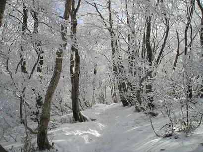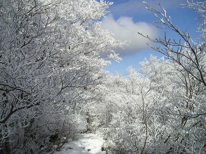 | いよいよ待望の霧氷の中へと入って行く。素晴らしい自然の芸術に皆さんから歓声が上る。思い思いにカメラを向け、足がなかなか進まない。特に三ノ岳から山頂にかけては、霧氷も大きく見事である。それにバックが青空というのも嬉しい。特に私個人が一番好きな場所は、すぐ左上の写真の三ノ岳を過ぎて山頂への登りの手前50Mぐらいの間の少し平坦な場所。ここは霧氷のトンネルと呼ぶに相応しく、何度かTOPの写真にも使った事がある。 りんちゃんがまた霧氷の味見?をしてくれると期待したが・・(笑) |