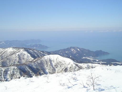 続く急登も、広がる青空と展望に癒されそれほど辛くない。一ノ岳の展望所はすっかり雪の下で分からないが、1本だけあるヤシャブシの木が目印である。少し休憩し展望を楽しんでいると、若狭町の方が登って来られた。2ヶ月ぶりの野坂だそうだ。少し話をして先に行ってもらう。