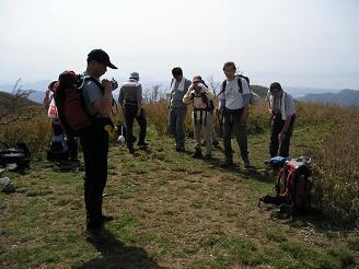 真ノ谷の上部、御池と鈴北峠の分技でmakotoさんとさきょうさんが待っておられた。皆さんに詫びを入れるmakotoさん!(笑)