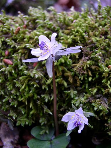 お猿岩と呼ばれる所から急坂が始る。右側に歩きやすい迂回コースが新設されていたようだが、なぜか元のコースを選んでしまう。(^^ゞ 岩石地帯の急坂!おまけに泥で滑りやすくて緊張の連続だった。見晴しは大した事がない・・見晴台に着く。ここから汗フキ峠までミスミソウに注意しながら下るが、汗フキ峠の少し手前で葉だけの群生を見つける。(^_^;) 残念ながら少し遅かったようだ。