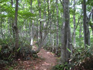 | 山頂下のブナ林に入ると、適度な風もあって癒され足取りも軽くなる。ミヤマヨメナがひっそりと咲いている。 | |||