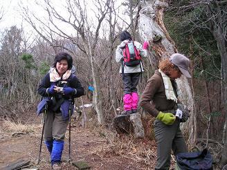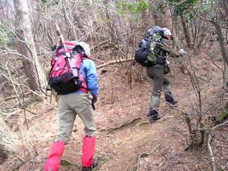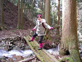 ミツマタがキレイに咲いていて一斉にカメラが向けられる。最後の水場を過ぎて本格的な登山道になる。恐る恐る木橋を渡るが、チーさんはちょっと余裕か?「もう1度やってくれん?」という要望に・・本当に応えてくれた。サービス精神の旺盛な方だ。別に落ちるのを期待して言ったわけではないので・・(^^ゞ