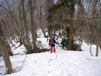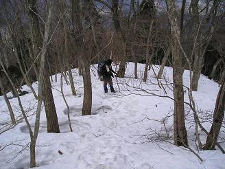 直登してきた尾根を一気に下る。和たんさんがここで大爆発!?トレースのないとこを走り出す。上りと違って水を得た魚?のようである。5〜6回は股までハマっていたのはしっかり見せていただいた(笑) チーさんは、最後尾で私達のすべてを見ていたのだろうか?(笑) クニさんを交えての「夫婦崩壊松(笑)」