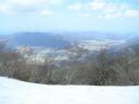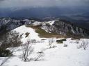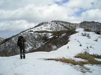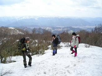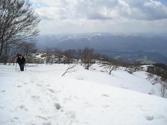 「風神」を過ぎてこの山の最大の魅力の雪原(草原)へ!視界が一気に開けて歓声が上る。雲が多いながらも素晴らしい展望だ!すぐ南には三重ヶ嶽、遠くには比良の武奈も見える。西には若狭駒ヶ岳、多田ヶ岳や青葉山などが見え、北には若狭湾や三方五湖が見渡せる。・・・本当に良かった。。f(^-^; 恐れをなしたのか?・・思ってたより風が弱い。素晴らしい展望に足がなかなか進まない。目の前の山頂まで緩やかな雪原を歩く。みれさんがどんどん行く。おかしいな?先日のスキーで足が痛い!とか言ってたはずなんだが。。大好きな雪を見て変ったのだろうか?(笑)
