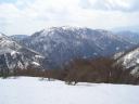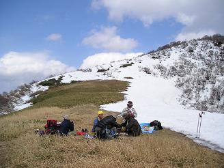 最後の坂を登って山頂へ!標識の頭が少し覗かせている。チーさんのカメラで記念撮影。ここからは大御影山などの東の山々が見渡せる。思う存分景色を味わったら次は食事を味わう番である(笑) 先程の雪原の雪のない所まで下りる事にする。
