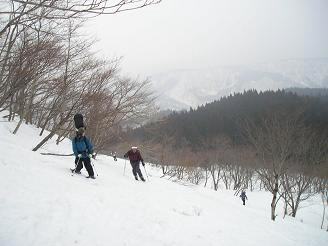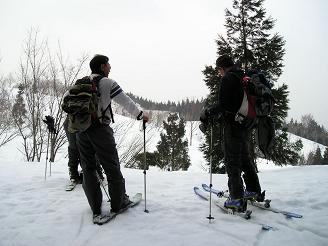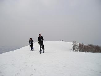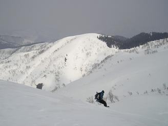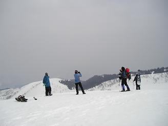 山頂は相変わらずの曇空だが風がなく穏やかだ。白山は当然ながら陰も形も見えない。頭の中で想像するだけである(笑) 大長山が少し見える程度。目の前に、こつぶり山〜護摩堂山への稜線が見える。みなさんはあの稜線を滑りながら・・登り返しながら行かれるのだ。けっこう距離がありそうだ。みなさんが滑る準備に取り掛かる。私はここでお別れだ。みなさんの滑降を見て引き返す事にする。