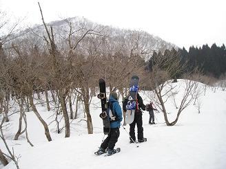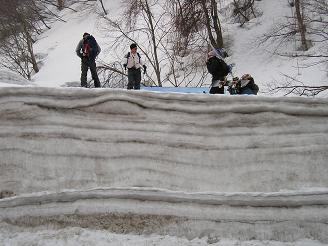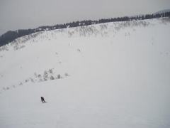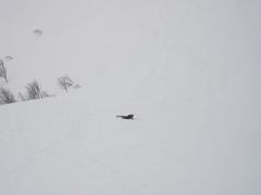 みなさんと涙のお別れをし、独り淋しく引き返すのだが帰りもなかなか難儀だった。雪がいっそう緩んでいて落とし穴状態。何度もゴボりながら、終いには自分自身が情けなくなってしまう。・・わたしゃ独りこんなとこで何をしてるんだろう!?と。。(--;) 横着して急斜面を下ればすぐゴボり、抜け出した途端に滑って尻餅!そのまま自動的に無理やり尻セード!敷物や秘密兵器などの小物は一切必要ない。ズボンのままでもかなりのスピードが出る。おかげで短縮はできたが・・あの格好だけは絶対人には見られたくはない。そんな独り遊び?を強制?させられたおかげで、駐車場に戻る頃にはフラフラ状態だった。。(~_~;