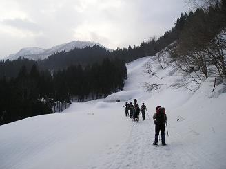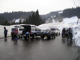 敦賀インターで和たんとみれさんと待ち合わせ、2台で5時半に出発する。R365で今庄に入ると雨が降ってくる。おかしい、今日の天気はいいはず!?誰のせい!?(^_^;) スタンドやコンビニに寄りながら、待ち合わせ時間の10分前に国道脇の駐車場に着く。もうすでに他のみなさんは待っておられた。(^^ゞ 挨拶を交し、早速準備に取り掛かる。今日のみなさんのスタイルは、shonさんとドッポさんがフリートレック、ひろろとろろさんは山スキー、K女史さんとHさんはボード&スノーシュー、和たんはスノーシュー、みれさんはショートスキー&カンジキ、私はカンジキである。私以外のみなさんは、取立山〜護摩堂山へ縦走して滑って下りてくる予定だ。雪壁のようになった東山いこいの森の入口で、私達3人を待ってくれているみなさん。和たんは駐車場からスノーシューで歩き出したが、私とみれさんは大丈夫だろうとツボ足で歩き出す。ところが、入口から数歩入っただけでゴボゴボ!一昨日の雨と気温の急上昇でザクザク状態である。これはたまらないとすぐにカンジキを履く。みれさんはカンジキの留め方を忘れたと言うし(笑)・・なんやかんやでみなさんにはかなりお待たせして申し訳なかった。(^^ゞ